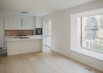 Das ideale Wohnkonzept: moderne und durchdachte Grundrisse in Kombination mit hochwertiger Ausstattung. Vom edlen Bodenbelag über gespachtelte Wände, namhafte Sanitärausstattung bis hin zu maßangefertigter Möblierung in Küche, Bad und Flur lassen diese Wohnungen keine Wünsche offen. Eichenparkett sorgt in den Wohn- und Schlafräumen für optische Wärme und moderne Feinsteinzeugfliesen sind in den Bädern verlegt. Die individuell geplanten Einbauküchen sind mit hochwertigen Elektrogeräten ausgestattet und schaffen durch die hellen Fronten in Kombination mit dem Eichenparkett Harmonie und Behaglichkeit. In den 2-Zimmer-Wohnungen ist ein Badezimmer mit Badewanne & Dusche integriert. Für die 3- bis 5-Zimmer-Wohnungen wurde zusätzlich zum Masterbad mit Dusche & Wanne – ein Gäste-WC oder ein Gästebad mit Dusche konzipiert. Außerdem verfügt jede Wohnung über einen Balkon, Terrasse oder Loggia, welcher am offenen Wohnbereich anschließt. Alle Fenster erhalten elektrische Außenjalousien. Die Wohnungen im 5. OG und 6. OG erhalten darüber hinaus terrassenseitige Markisen. Zusätzlich zum eigenen Kellerabteil ist in jeder Wohnung ein separater Hauswirtschaftsraum realisiert worden.